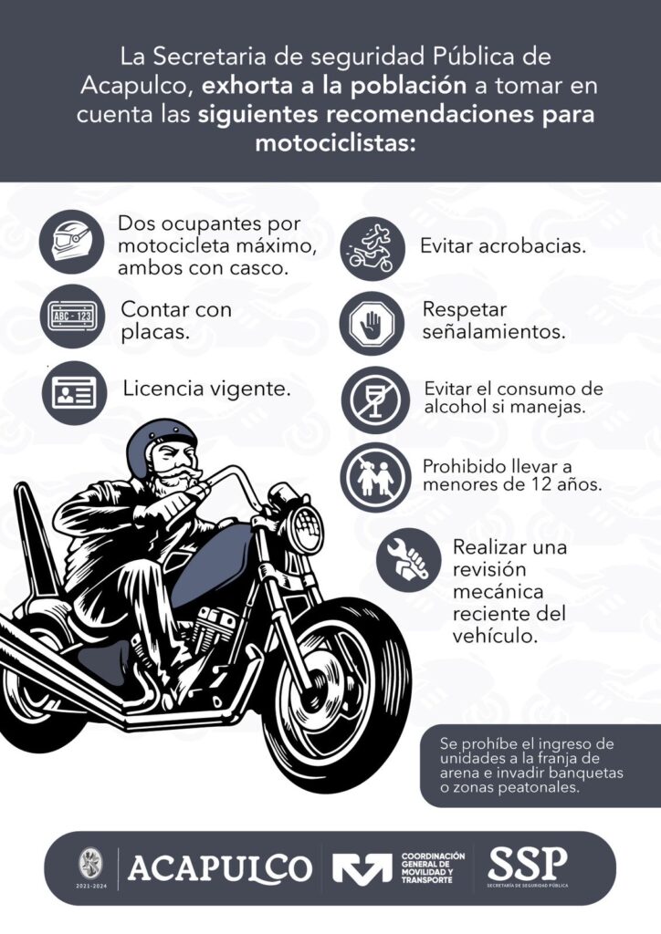 La Secretaría de Seguridad Pública hace un llamado a la las personas que acudirán al evento del “Acamoto”, que cuenten con las placas de sus vehículos, utilizar casco, solo 2 personas arriba de la motocicleta y portar licencia vigente.