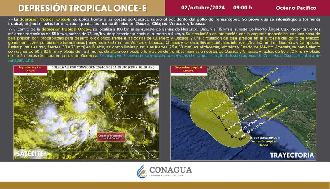 La depresión tropical Once-E, se ubica en estos momentos a 100 kilómetros al sur-sureste de Bahías de Huatulco, Oaxaca, y a 115 kilómetros al sureste de Puerto Ángel, Oaxaca.