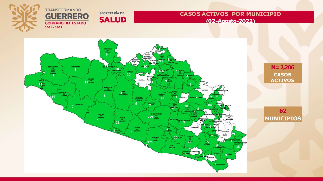 A nivel nacional Guerrero se ubica en el lugar 21 en casos activos, y concentra 2,206 en 62 municipios, entre los que destacan: Chilpancingo, 779; Acapulco, 376; Taxco, 193; Iguala, 160; Zihuatanejo, 116; Ometepec, 93; Tlapa, 84; Chilapa, 78; Tixtla, 25; y Ayutla de los Libres, 18.