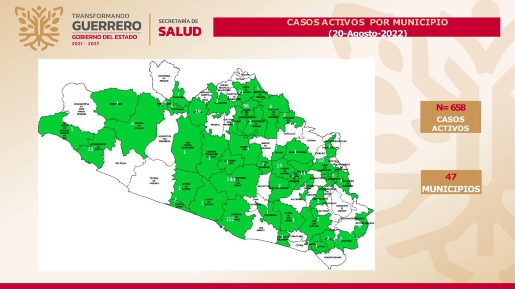 Indicó que desde el inicio de la epidemia, el estado de Guerrero acumula 115,077 casos confirmados y 6,821 defunciones, manteniéndose en el lugar 25 a nivel nacional en casos activos, que se concentran en 47 municipios, entre ellos Chilpancingo, con 180; Acapulco, 112; Iguala, 86; Taxco, 71; Tlapa, 32; Zihuatanejo, 23; Arcelia, 19; Chilapa, 15; Atlixtac, 11, y Pungarabato, 10.