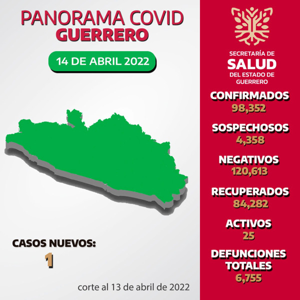 Chilpancingo, Gro., 14 de abril 2022.- La Secretaría de Salud Guerrero (SSG) informó que al corte del 13 de abril la entidad se mantiene en color verde del semáforo epidemiológico con 25 casos activos de COVID-19, de los cuales un nuevo caso y cero defunciones se confirmaron en las últimas 24 horas.