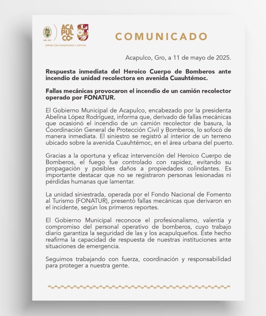 Acapulco de Juárez, Gro., 11 de mayo de 2025. — El Gobierno Municipal de Acapulco, encabezado por la presidenta Abelina López Rodríguez, informa que, derivado de fallas mecánicas que ocasionó el incendio de un camión recolector de basura, la Coordinación General de Protección Civil y Bomberos, lo sofocó de manera inmediata. El siniestro se registró al interior de un terreno ubicado sobre la avenida Cuauhtémoc, en el área urbana del puerto.