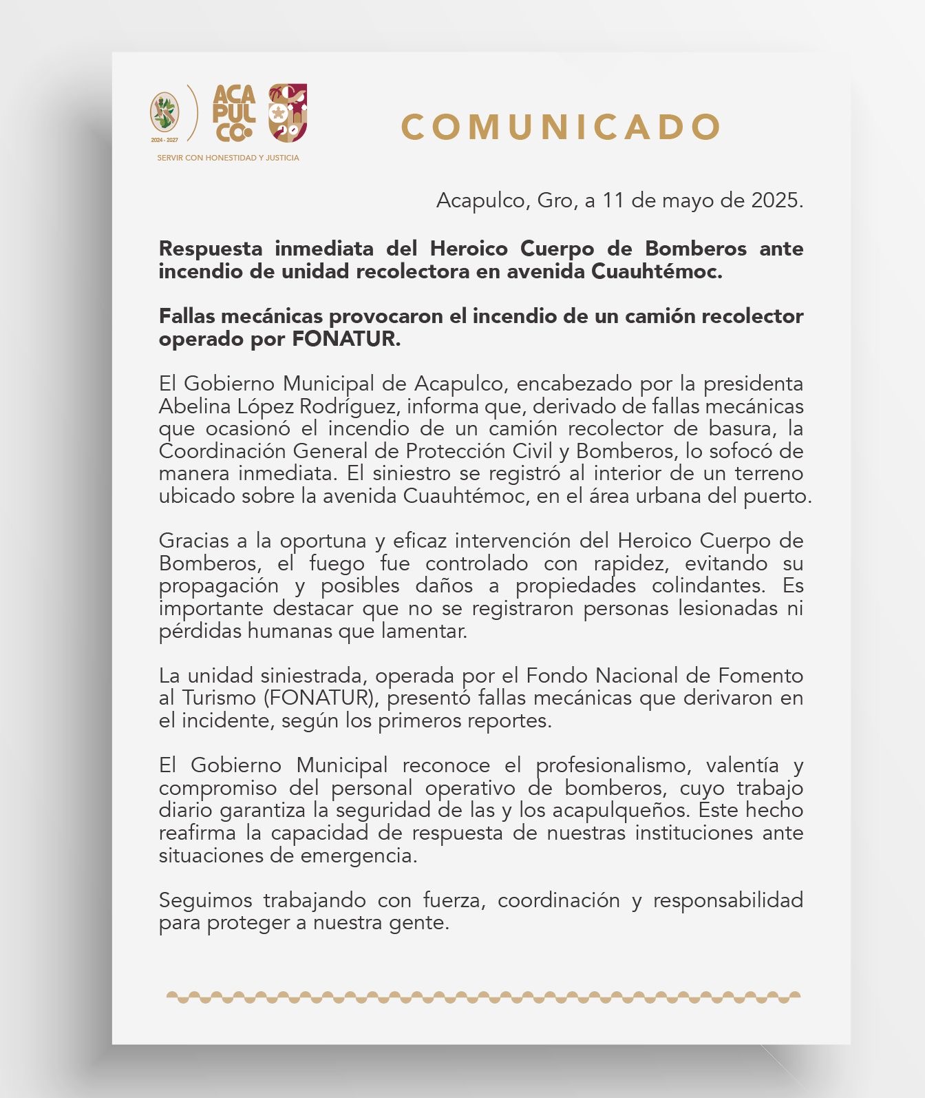 El Gobierno Municipal reconoce el profesionalismo, valentía y compromiso del personal operativo de bomberos, cuyo trabajo diario garantiza la seguridad de las y los acapulqueños. Este hecho reafirma la capacidad de respuesta de nuestras instituciones ante situaciones de emergencia.