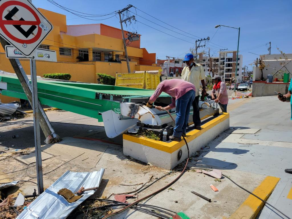 Acapulco, Gro., 28 de noviembre de 2023.- El gobierno que encabeza la Presidenta Municipal, Abelina López Rodríguez, a través de la Dirección de Conservación y Mantenimiento, realiza el retiro de espectaculares caídos y repara rejillas e infraestructuras que resultaron dañados por el huracán “Otis”.