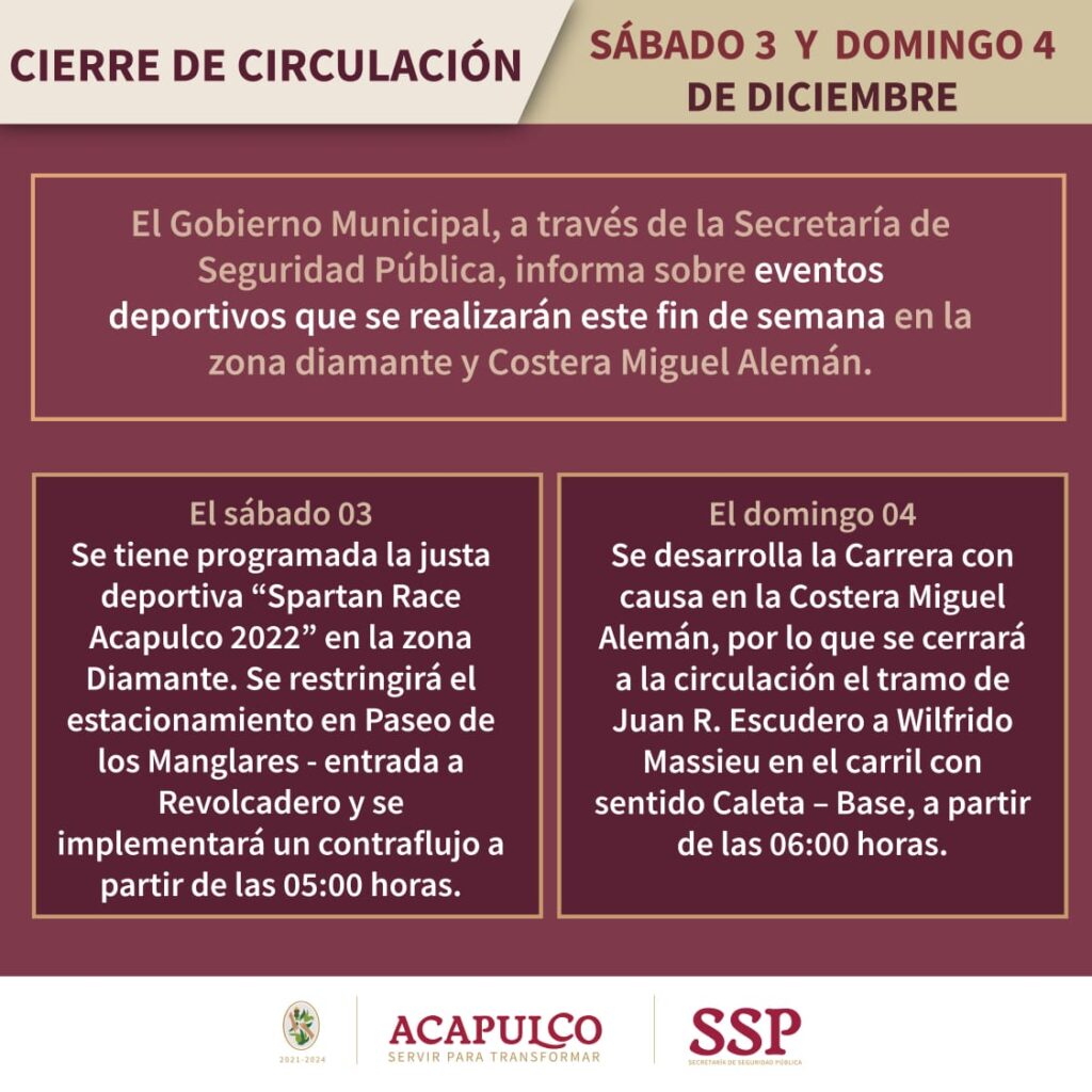 Para el sábado 03, se tiene programada la justa deportiva “Spartan Race Acapulco 2022” en la zona Diamante. Los competidores realizarán diferentes pruebas atléticas, por lo que se restringirá el estacionamiento en Paseo de los Manglares –entrada a Revolcadero- y se implementará un contraflujo a partir de las 05:00 horas.