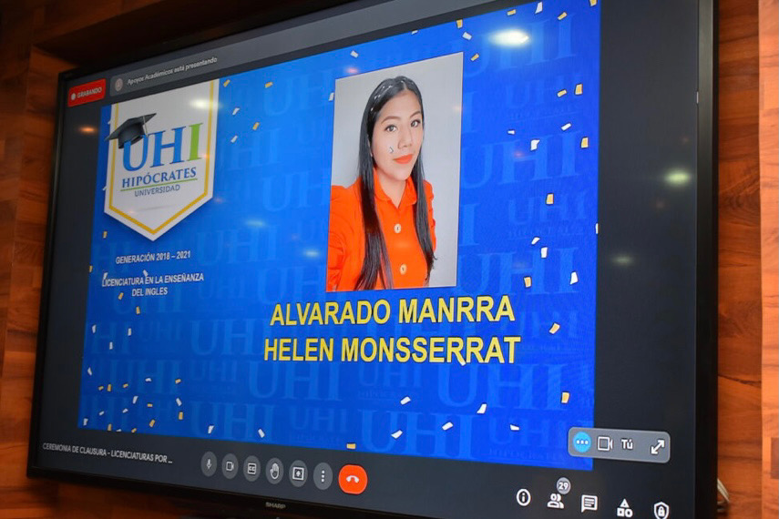 La Universidad Hipócrates realizó este 21 de agosto, la ceremonia virtual de graduación de las Licenciaturas Semiescolarizadas generación 2018-2021, encabezada por la Mtra. Marisol Manzanarez Nava, rectora de nuestra casa de estudios.