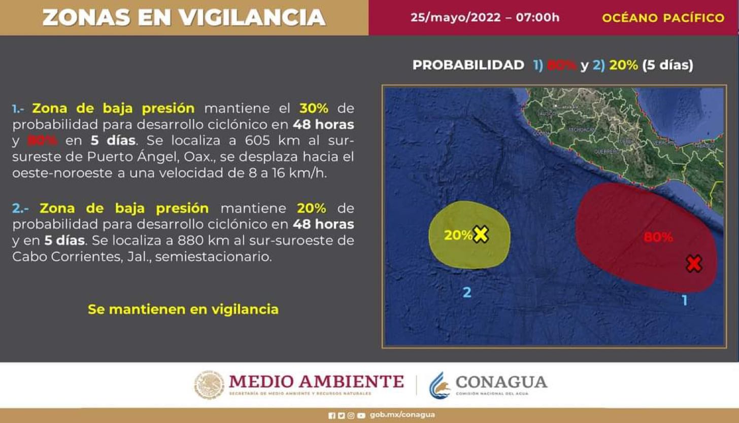 En la misma cuenca, otra zona de baja presión continúa con 20 por ciento de probabilidad de desarrollo ciclónico en el pronóstico a 48 horas; localizándose aproximadamente a 880 km al sur-suroeste de Cabo Corrientes, Jalisco, y se encuentra semiestacionaria.