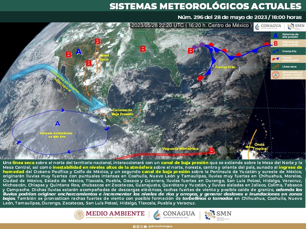 El SMN detalla que durante esta noche y la madrugada del lunes, una línea seca sobre el norte del territorio nacional interactuará con un canal de baja presión que se extiende sobre la Mesa del Norte y la Mesa Central. Además, se espera inestabilidad en niveles altos de la atmósfera sobre el norte, noreste, centro y oriente del país. A esto se suma el ingreso de humedad del Océano Pacífico y Golfo de México, así como un segundo canal de baja presión sobre la Península de Yucatán y sureste de México, lo cual originará las condiciones mencionadas anteriormente.