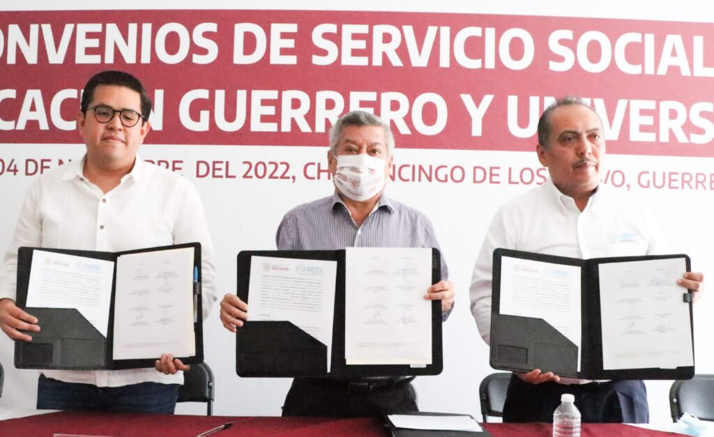 Chilpancingo, Gro., 4 de noviembre de 2022.- Para retribuir a la comunidad, el titular de la Secretaría de Educación Guerrero, Marcial Rodríguez Saldaña, firmó dos convenios de servicio social con la Asociación Guerrerense de Escuelas Privadas de Educación Superior (AGEPES) y la Universitare Américane Mexique (UAM) para que alumnos de más de 18 universidades privadas del estado de Guerrero puedan hacer servicio social en el sector público y gubernamental.