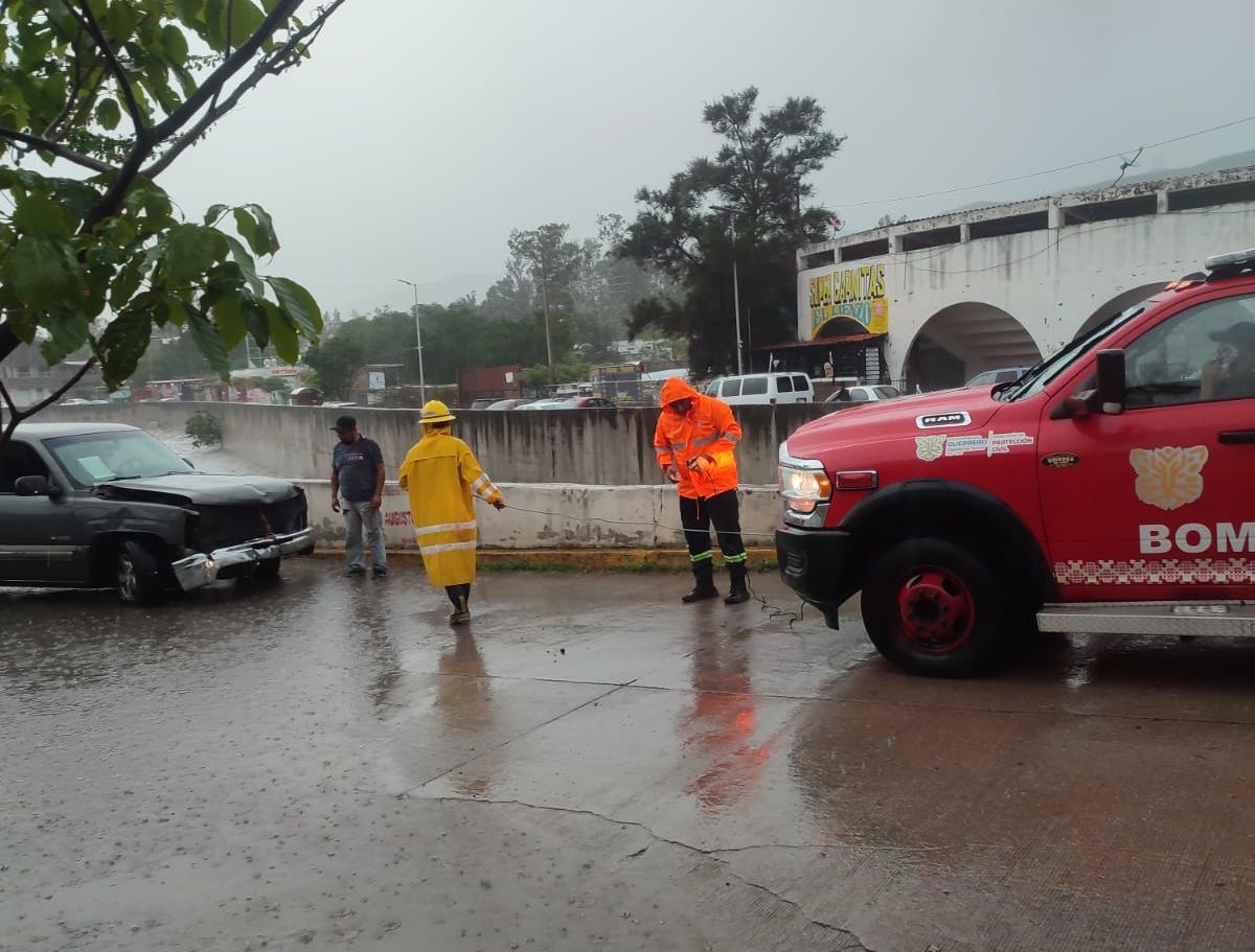 Entre los servicios que fueron atendidos en coordinación con otras dependencias de gobierno, destaca el colapso de un tramo de la barda perimetral de las instalaciones de la 35 Zona Militar, junto al encauzamiento del Río Huacapa, así como un árbol caído en el estacionamiento de la tienda de autoservicio Sams Club.