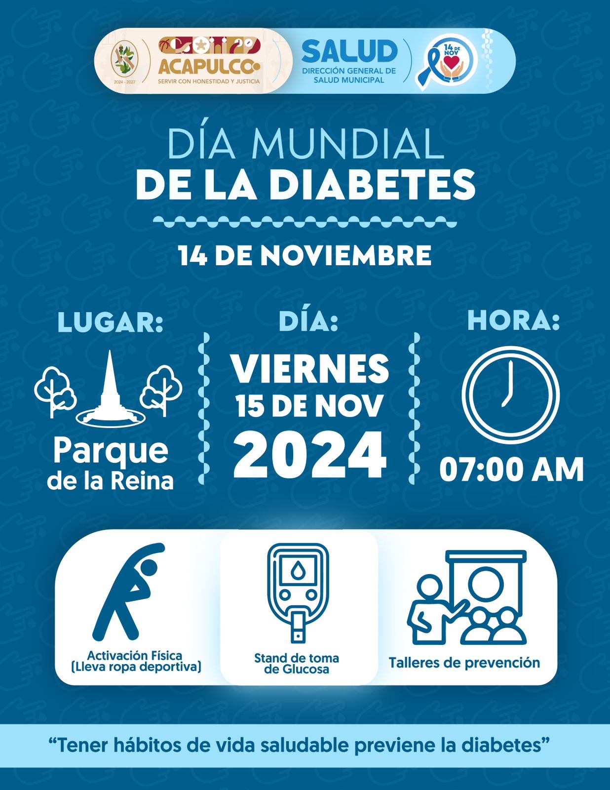 Este jueves 14 de noviembre en el Día Mundial de la Diabetes Mellitus, el director general de Salud Municipal, Aniceto Leguizamo Dimas hizo la invitación al público en general a acudir este viernes al parque de La Reina, en punto de las 7:00 de la mañana para participar en este evento en el que se realizarán actividades como activación física, stand de toma de glucosa y talleres de prevención.