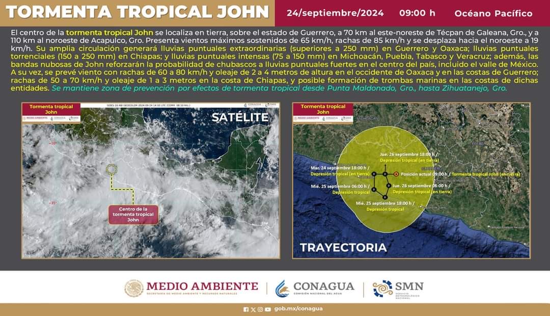 A las 9:00 horas de este martes, la tormenta tropical “John” se ubicó a 70 kilómetros al este-noreste de Técpan de Galeana, Guerrero y a 110 kilómetros al noroeste de Acapulco, Guerrero, por lo que se llama a la población a continuar tomando precauciones.