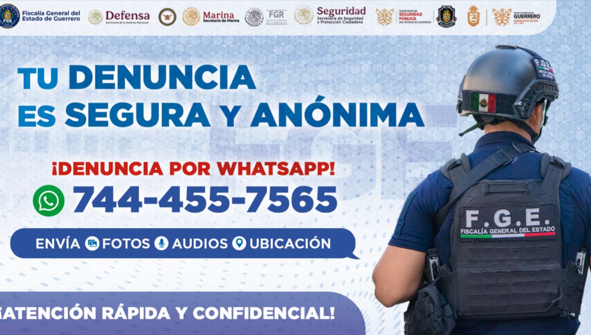 Chilpancingo, Gro., a 4 de noviembre de 2025.– La Fiscalía General del Estado de Guerrero, informa a la ciudadanía que se mantiene activo el servicio de denuncia anónima y segura, disponible a través del número 744-455-7565, por llamada o WhatsApp.