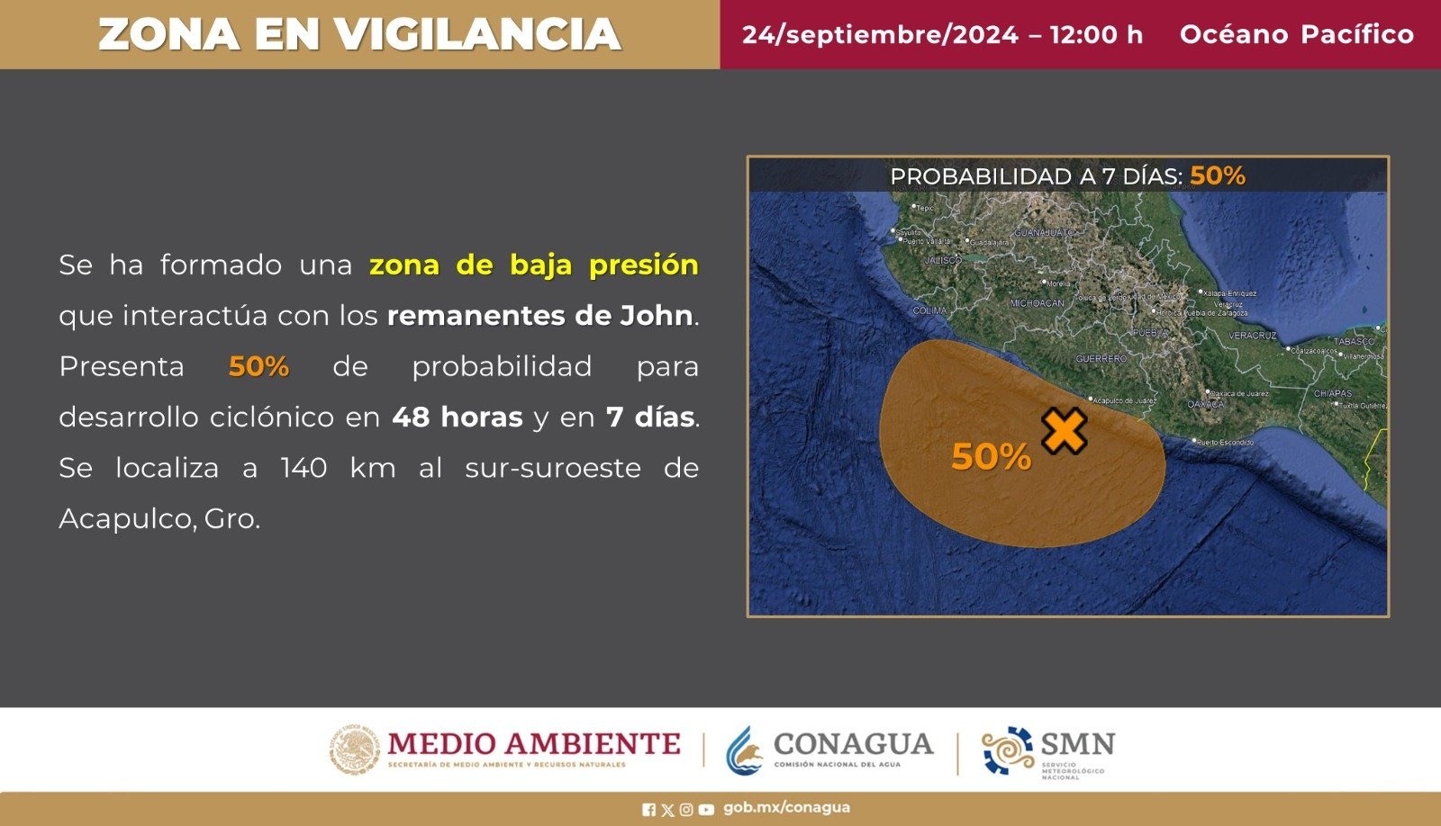 Con información del Servicio Meteorológico Nacional (SMN), la coordinación indica que la zona de baja presión en mención, interactúa con los remanentes de “John” y presenta 50 por ciento de probabilidad para desarrollo ciclónico en 48 horas y en siete días.